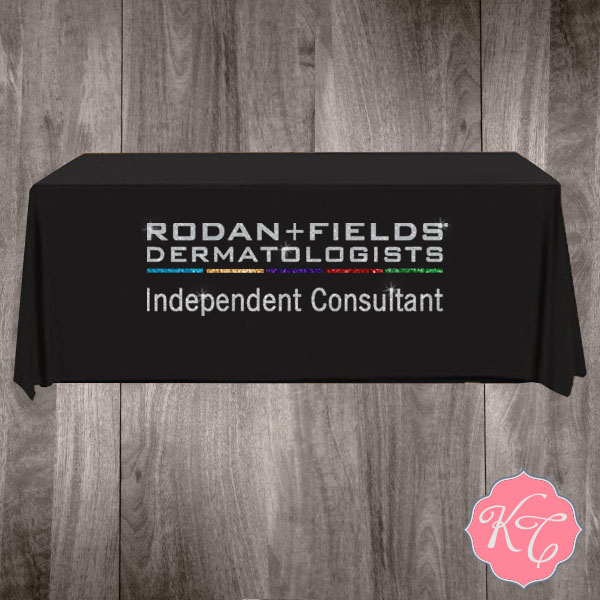 This custom branded table cloth is fitted for a 6' table. This is full glitter design. The logo design is 20-30" wide. Height proportionate. VERY High class look for any show. The folded edges makes it easy to drop the table cloth on with no adjusting trying to cover the whole table. Covers all 4 sides down to the floor.