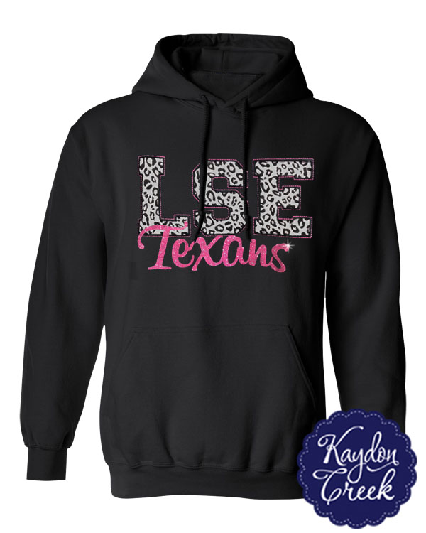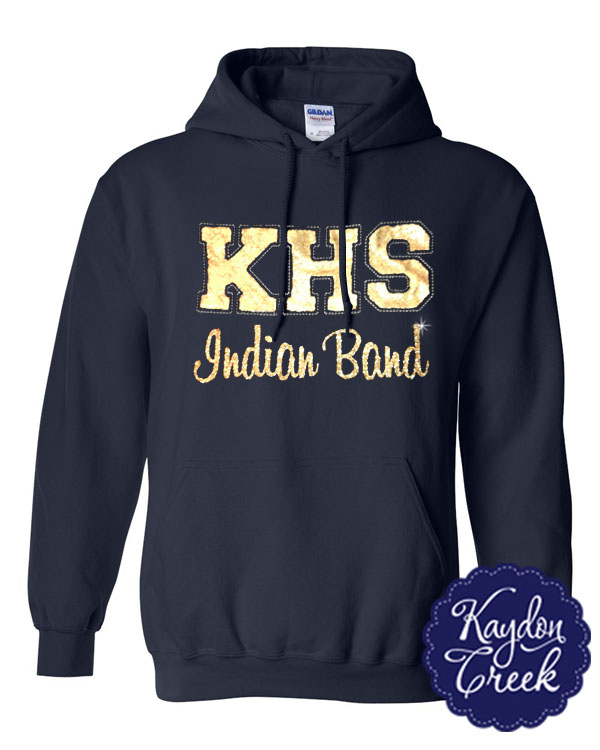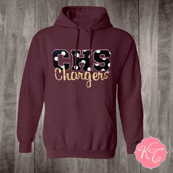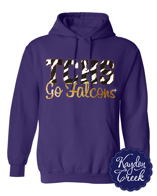 These hoodies are made to order and flying off the shelf. We can do any text and color scheme. Looks best with 3-4 letters in knockout applique with fabric and contrast stitching of your choice, and top it off with a little glitter text.