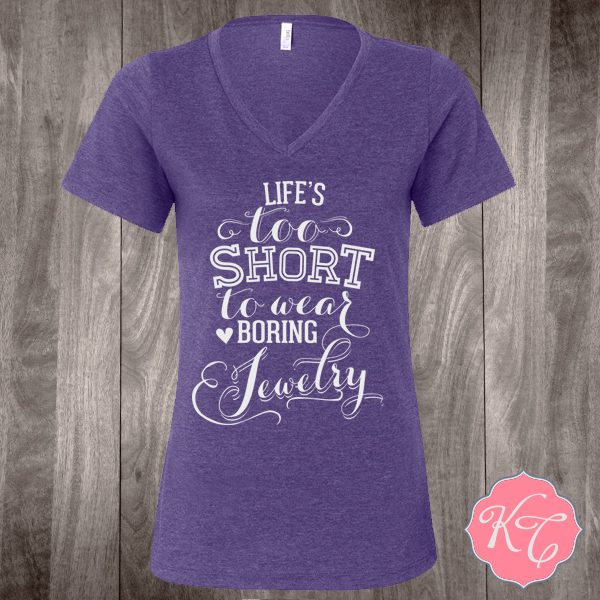 Life is too short to wear boring jewelry on a Tri-blend Purple missy fit v-neck tee. In the notes on the order please note matte white, gold or silver foil.