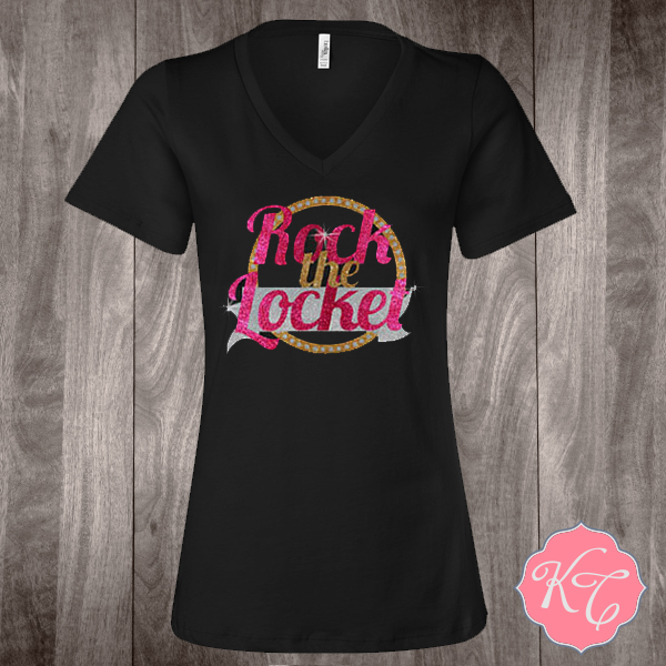 This Rock the Locket shirt was inspired by Origami Owl Living lockets. Great shirt for team members to wear while showing off their locket line. The design is full glitter on a Turquoise missy fit v-neck tee.