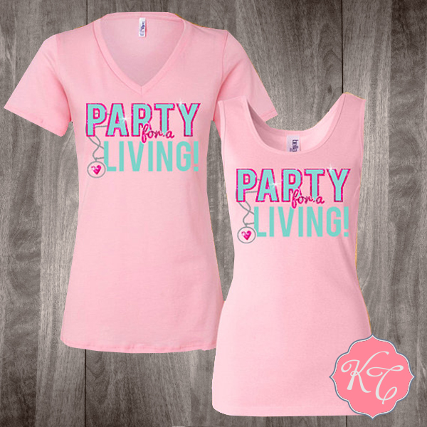 Party for a Living inspired by Origami Owl consultants. Choose from a light pink missy (true ladies fit) v-neck or tank top. Design is matte teal, glitter hot pink, and silver foil. Lots of textures one this one!